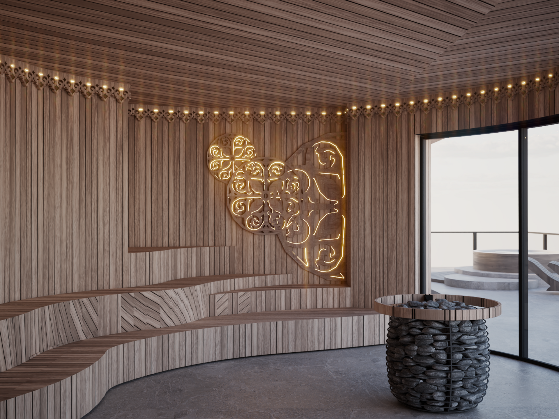 To, co wyróżni Sky Sauna & Spa, to nie tylko sama oferta, ale sposób, w jaki została zaprojektowana cała przestrzeń. Jednym z najbardziej unikatowych elementów będą duże przeszklenia w saunach, otwierające wnętrza na widok stoku i gór. W Polsce nadal nie jest to standard w obiektach wellness & spa, dlatego właśnie ten element może stać się jednym z najmocniejszych wyróżników całej strefy. Zamiast zamkniętych pomieszczeń powstanie przestrzeń, w której architektura będzie prowadzić dialog z krajobrazem, a pobyt w saunie stanie się czymś znacznie bardziej intensywnym wizualnie i emocjonalnie. Bardzo mocnym akcentem będzie również okrągła sauna rytualna na drugim poziomie, mocno przeszklona i otwarta na widok otoczenia. Całość uzupełni bezpośrednia kładka do Infinity Sky 36°, kamienna grota schładzania, pokój solny z widokiem na stok, tężnia solna oraz wypoczywalnie zaprojektowane tak, by podkreślały premium charakter tego miejsca. To właśnie te rozwiązania sprawiają, że Sky Sauna & Spa ma szansę wyróżnić się nie tylko jako hotel ze spa, ale jako projekt o wyraźnie mocniejszej tożsamości.